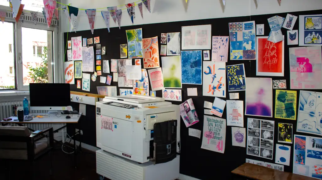 Wir drucken mit dem Riso (Modell: MF9350), ein Drucker der eine ganz eigene und außergewöhnliche Ästhetik hat. Das Druckverfahren ähnelt dem des Siebdruckes. Es handelt sich um ein Schablonen-Druckverfahren bei dem das Motiv in eine Masterfolie, die als Schablone dient, eingebrannt wird. Diese Folie wird auf eine Farbtrommel gespannt, diese wiederum rollt im Drucker über das Papier und druckt somit durch die Masterfolie das Motiv.